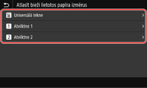 Papīra iestatījumu ekrānā parādīti reģistrētie bieži lietotie papīra formāti. Ja tiek parādīti nelietoti papīra formāti, varat tos katram papīra avotam paslēpt, lai atvieglotu papīra formāta izvēli.