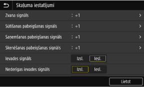 [Zvana signāls], [Sūtīšanas pabeigšanas signāls], [Saņemšanas pabeigšanas signāls], [Skenēšanas pabeigšanas signāls] (modeļiem ar faksa funkciju)