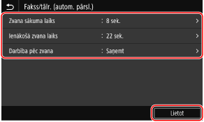 Ja ir iespējota funkcija [Fakss/tālr. (autom. pārsl.)], lai noteiktu, vai ienākošais zvans ir fakss, varat konfigurēt arī tādus iestatījumus kā zvanīšanas reižu skaits.