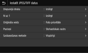 Lai konfigurētu drukas iestatījumus JPEG un TIFF failiem, piemēram, lai pielāgotu attēlu kvalitāti, izmantojiet šo ekrānu.
