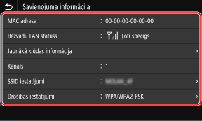 Līdz ar MAC adresi un bezvadu LAN savienojuma informāciju, kad iekārta ir pievienota bezvadu LAN, varat skatīt arī drošības iestatījumus.