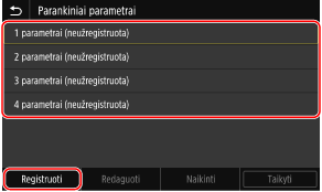 Galite registruoti parametrus pagal savo tikslą ir parametrus, kuriuos norite iškviesti kaip parankinius parametrus nuskaitymo, fakso ir kopijavimo funkcijoms.