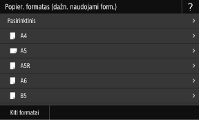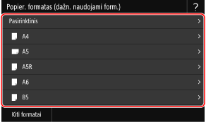 1 veiksmo ekrane galite pakeisti rodomą popieriaus formatą. Nenaudojamų popieriaus formatų paslėpimas