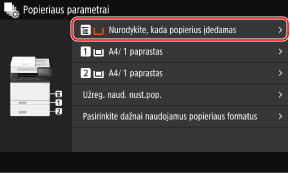 Jei daugiafunkciam dėklui visada naudojate tokį patį popierių, popieriaus formatą ir tipą galite užregistruoti. Taip nebus rodomas popieriaus parametrų ekranas, kurių jums nereikės konfigūruoti.