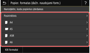 Pasirinkite popieriaus formatą, kuri norite užregistruoti.