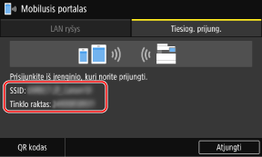 Skirtuke [Tiesiog. prijung.] patikrinkite aparato SSID ir tinklo raktą.