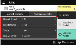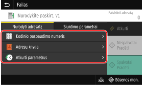 Jei siunčiant adresatas yra apribotas dėl siuntimo funkcijos autentifikavimo parametrų, negalėsite nurodyti kito adresato. Dėl išsamesnės informacijos kreipkitės į administratorių.