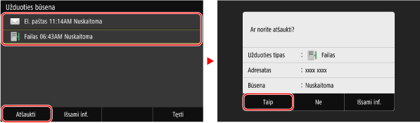 Jei rodomas užduočių sąrašo ekranas, pasirinkite užduotį, kurią norite atšaukti, ir paspauskite [Atšaukti]