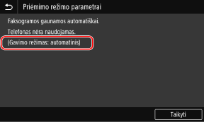 Pasirodžius pranešimui [Parametrai sukonfigūruoti.], bus parodytas ekranas [Priėmimo režimo parametrai].