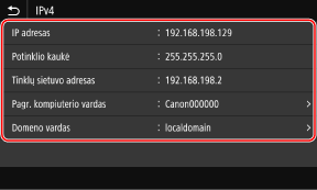 Galite peržiūrėti aparatui nustatyto IP adreso parametrus, pvz., IPv4 adresą ir IPv6 adresą.