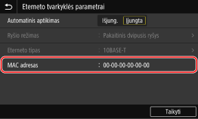 Kai aparatas prijungtas prie laidinio LAN, galite peržiūrėti aparatui nustatytą MAC adresą.