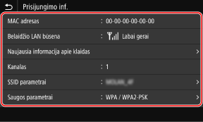 Kai aparatas prijungtas prie belaidžio LAN, be belaidžio LAN MAC adreso ir ryšio informacijos, taip pat galite peržiūrėti saugumo parametrus.