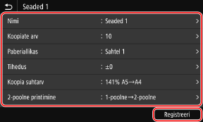 Te saate registreerida sätteid vastavalt otstarbele ja sätetena, mida soovite kuvada skannimise, faksimise ja kopeerimise funktsioonide lemmiksätetena.