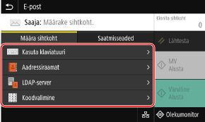 Sihtkohtade määramineKoopiate ja varukoopiate sihtkohad saate määrata funktsiooniga [Aadressiraamat] või [Koodvalimine].