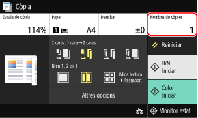 Premeu [Nombre de còpies], utilitzeu les tecles numèriques per introduir el nombre de còpies i premeu [Tancar].