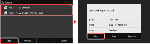 Bir iş listesi ekranı görüntülenirse iptal edilecek işi seçin ve [İptal]