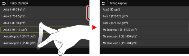 Όταν εμφανίζεται η γραμμή κύλισης στην οθόνη, σημαίνει ότι υπάρχουν στοιχεία ή πληροφορίες που δεν είναι δυνατό να εμφανιστούν εξ ολοκλήρου στην οθόνη. Κινήστε ή σύρετε για κύλιση της οθόνης προς την κατεύθυνση στην οποία μετακινήσατε το ακροδάχτυλό σας.