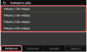Χρησιμοποιήστε τον πίνακα λειτουργίας για να καταχωρίσετε Αγαπημένες ρυθμίσεις. Δεν μπορείτε να καταχωρίσετε Αγαπημένες ρυθμίσεις μέσω Remote UI (Απομακρυσμένο περιβάλλον εργασίας) από έναν υπολογιστή.