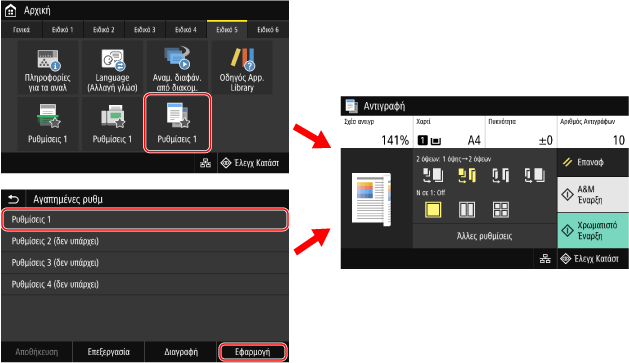Μπορείτε να καλέσετε καταχωρισμένες ρυθμίσεις για γρήγορη λειτουργία με τα κουμπιά συντόμευσης που προστίθενται στην οθόνη [Αρχική] του πίνακα λειτουργίας και στην οθόνη κάθε λειτουργίας. Μπορείτε επίσης να αλλάξετε τις ρυθμίσεις αφού τις καλέσετε, όπως απαιτείται.