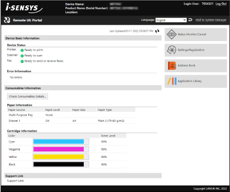 Όταν συνδέεστε στο Remote UI (Απομακρυσμένο περιβάλλον εργασίας), εμφανίζεται η σελίδα Πύλης (η κεντρική σελίδα του Remote UI). Από εδώ, μπορείτε να ελέγξετε την κατάσταση λειτουργίας της συσκευής, να δείτε διάφορες πληροφορίες και να αλλάξετε τις ρυθμίσεις με τη χρήση κουμπιών.