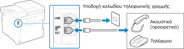 Συνδέστε το παρεχόμενο καλώδιο τηλεφώνου στην υποδοχή καλωδίου γραμμής τηλεφώνου (LINE) στη συσκευή και σε μια πρίζα τηλεφώνου.