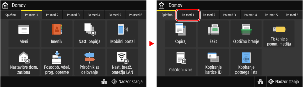 Dotaknite se zaslona in potisnite s konico prsta. Zaslon se premika v smeri, v katero ste ga potisnili s prstom. Na primer zaslon [Domov] se premakne na zavihek v smeri, ki ste ga potisnili s prstom.