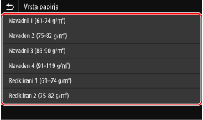 Ko v večnamenski pladenj vložite papir, je na nadzorni plošči privzeto prikazan zaslon za nastavitev velikosti in vrste papirja.