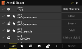 Când apelați agenda de pe ecranul [Pornire] sau de pe ecranul de scanare sau fax, se afișează ecranul următor.