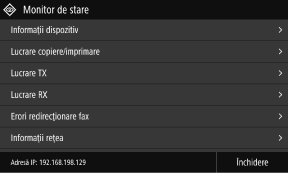 ] pe panoul de operare. În mod implicit, ecranul [Pornire] este afișat imediat după cuplarea alimentării electrice și imediat după închiderea ecranului de pornire, respectiv imediat după conectare. Ecranul [Pornire]