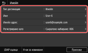 Ако използвате LDAP сървър, регистрирайте LDAP сървъра, който ще се използва за търсене на местоназначения към устройството. Регистриране на LDAP сървъри |