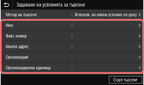 4 | Изберете [Метод на търсене] и изберете условията за търсене. За да търсите потребители, които отговарят на всички елементи, посочени в Стъпка 3, изберете [Използ. на всички условия по-долу]. За да търсите потребители, които отговарят поне на един от елементите, посочени в Стъпка 3, изберете [Използв. на някои условия по-долу]. |