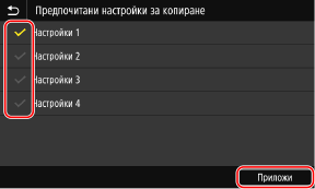 Поставете отметки в квадратчетата на настройките, които искате да зададете като бутони за бърз достъп, и натиснете [Приложи].
