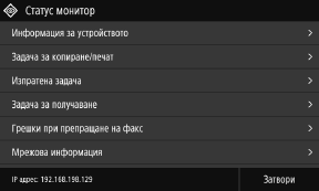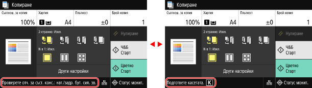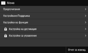Промяна на дисплея на екранаМожете да промените дисплея на операционния панел, например като промените езика на дисплея и мерните единици, както и да показвате или скривате съобщенията. [Настройки за извеждане] Можете да инвертирате цветовете на екрана и да регулирате яркостта, за да направите екрана по-лесен за гледане. [Достъпност] Автоматично изчистване на настройкитеПо подразбиране, ако след определен период от време не се извършват никакви операции, настройките, конфигурирани на екрана, се изчистват и се показва екранът [Начало]. Можете да променяте часа, докато настройките бъдат изчистени, и екрана, който се показва след това. [Време за авт. Нулиране] [Функция след авт. нулиране] |