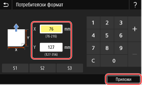 2 | Въведете стойностите в [X] и [Y], след което натиснете [Приложи]. Когато са регистрирани често използвани нестандартни размери, можете да ги извикате, като натиснете бутон от [S1] до [S3]. |