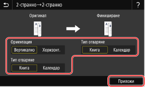 3 | Задайте ориентацията и типа на отваряне и натиснете [Приложи]. Появява се екранът [Други настройки]. |