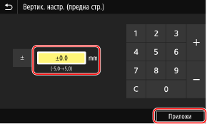 Посочете ширината за регулиране, като изберете положителна стойност, за да регулирате печата върху хартията надолу, или отрицателна стойност, за да регулирате печата върху хартията нагоре.