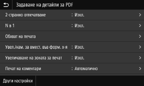 * Това е същата настройка като [N в 1] на екрана за настройки за печат от носител с памет. Но [9 в 1] и [16 в 1] са налични само за [N в 1] на екрана [Задаване на детайли за PDF]. |