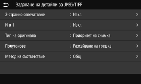Използвайте този екран, за да конфигурирате подробни настройки за печат за JPEG и TIFF файлове, като регулиране на качеството на изображението.
