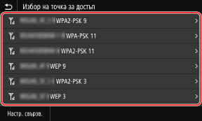 Потърсете безжичен LAN маршрутизатор (точка за достъп), към който да се свържете, и въведете мрежовия ключ. Когато се свързвате чрез метода за настройка с точка за достъп, се задават следните методи за удостоверяване и криптиране: Метод за WEP удостоверяване: Отворена система Криптиране за WPA/WPA2: AES-CCMP или TKIP се настройва автоматично в зависимост от избрания безжичен LAN маршрутизатор. За да посочите различен метод за удостоверяване или криптиране, използвайте метода за ръчна настройка, за да се свържете. Свързване към безжична LAN мрежа чрез задаване на подробни данни (метод за ръчна настройка) |