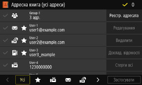 Вони відображаються з правого боку екрана. Натисніть, щоб зареєструвати, змінити або видалити адресата чи вказати адресата, для якого слід надіслати чи зберегти дані.