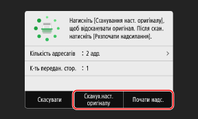 Щоб продовжити сканувати оригінали, розмістіть їх на склі експонування та натисніть [Сканув.наст. оригіналу].
