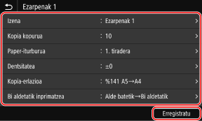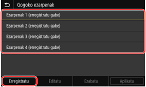 Ezarpenak zure helburuaren arabera erregistratu ditzakezu, baita eskaneatzeko, faxak bidaltzeko eta kopiatzeko eginbideetarako “Gogoko ezarpenak” gisa atzitu nahi dituzun ezarpenak ere.