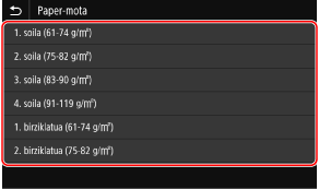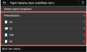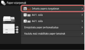 Papera erabilera anitzeko erretiluan kargatzen denean, paper-tamaina eta mota ezartzeko pantaila bistaratuko da eragiketa-panelean.