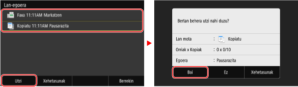 Lanen zerrendaren pantaila bistaratzen bada, hautatu ezeztatuko duzun lana eta sakatu [Utzi]
