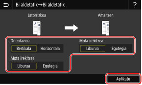 * Baliteke bi aldeetatik kopiatzeko aukera erabilgarri ez egotea hainbat paper-tamaina eta motarekin.
