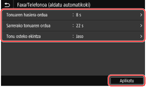 Ezarri hau RX modurako [Faxa/Telefonoa (aldatu automatikoki)] hautatuta dagoenean. Beste RX modu bat hautatu baduzu, ez duzu urrats hori egin behar.