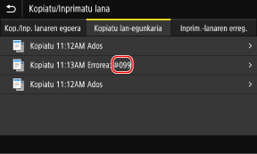 Ezin baduzu inprimatzea burutu, ezin badituzu eskaneatutako datuak edo faxa bidali edo jaso edo beste erroreren bat gertatzen bada, errore kodea (“#” ikurrarekin hasten den hiru digituko zenbakia) bistaratuko da txostenean edo lan-egunkarian.