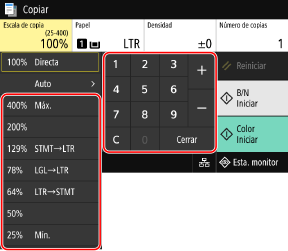 Selecciona una proporción de copia fija de al lista o introduzca una proporción personalizada con el teclado numérico y pulse [Cerrar].