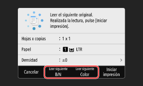 1 | Ponga el siguiente original sobre el cristal de copia y pulse [Leer siguiente B/N] o [Leer siguiente Color]. Se escanea el siguiente original y se muestra la misma pantalla. Repita este proceso hasta completar el escaneado de todos los originales. Puede seleccionar el modo de color (blanco y negro o color) de cada original. Para copiar el siguiente original en blanco y negro, pulse [Leer siguiente B/N]. Para copiar en color, pulse [Leer siguiente Color]. También puede pulsar [Densidad], [Tipo de original] y [Balance de color] para cambiar los ajustes de cada original. Si el tamaño del original es diferente, puede faltar parte de la imagen o esta puede imprimirse a menor tamaño en el papel. |