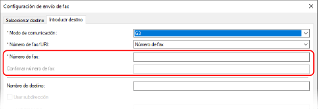 En la pestaña [Introducir destino], introduzca un número de fax. Si se puede introducir [Confirmar número de fax], introduzca el mismo número de fax.